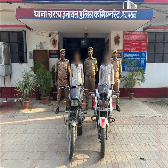 उत्तर प्रदेश प्रयागराज से बड़ी खबर। थाना सरायनाइत पुलिस ने एसओजी व सर्विलांस सेल की संयुक्त टीम के साथ मिलकर चोरी की दो मोटरसाइकिल और एक कूटरचित नंबर प्लेट बरामद की है। पुलिस ने दो अभियुक्तों को गिरफ्तार किया है, जिनकी पहचान प्रिंस राज पटेल निवासी मजियारी थाना सराय ममरेज और वीरेंद्र कुमार भारतीय निवासी देवकली कठार थाना सरायनाइत के रूप में हुई। वहीं एक बाल अपचारी को भी अभिरक्षा में लिया गया है। यह कार्रवाई सरायनाइत थाना क्षेत्र के कतवारूपुर रेलवे क्रॉसिंग के पास की गई। पुलिस आयुक्त प्रयागराज के निर्देशन में अपराधियों के खिलाफ चलाए जा रहे अभियान के तहत यह सफलता मिली है। सरायनाइत थाने में धारा 317/2, 317/4 और 345/3 के तहत मुकदमा दर्ज कर विधिक कार्रवाई जारी है। इस अभियान में थाना अध्यक्ष संजय कुमार गुप्ता, उपनिरीक्षक सुखचैन तिवारी, उपनिरीक्षक रामानुज सिंह सहित एसओजी व सर्विलांस टीम मौजूद रही। प्रयागराज से डिस्ट्रिक्ट इंचार्ज प्रदीप मिश्रा, फास्ट न्यूज़ इंडिया।