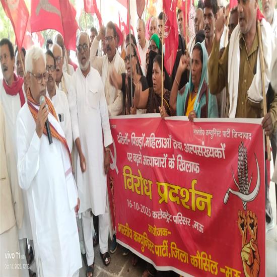 फ़ास्ट न्यूज़ इंडिया यूपी मऊ। भारतीय कम्युनिस्ट पार्टी के राज्यव्यापी आवाहन पर आज मऊ कलेक्ट्रेट परिसर में सैकड़ो भाकपा कार्यकर्ताओं ने जुट कर देश और प्रदेश में दलितों पिछड़ों महिलाओं तथा धार्मिक अल्पसंख्यकों के विरुद्ध बेलगाम होती जा रही घृणा हिंसा तथा भेदभाव के खिलाफ जोरदार प्रदर्शन किया। प्रदर्शनकारी बड़ी शिद्दत के साथ एक लम्बे समय से अनवरत जारी नौकरशाही सरकार तथा मीडिया घरानों की साम्प्रदायिक जातिवादी उन्माद पैदा करने घोर नफरती उन्मादियों का महिमा मंडन करने तथा हासिये के समाज को डेमोनाइज़ करने की भूमिका के खिलाफ अपने गम और गुस्से को व्यक्त करते हुए उन्होंने सामाजिक न्याय लोकतांत्रिक व धर्म-निरपेक्ष मूल्यों की रक्षा के लिए संघर्ष तेज करने की अपनी प्रतिबद्धता दुहराईं। प्रदर्शनकारियों ने जिलाधिकारी कार्यालय तक जुलूस निकालकर जिलाधिकारी के माध्यम से महामहिम राष्ट्रपति को ज्ञापन सौंपकर उच्चतम न्यायालय में इजलास पर मुकदमें की सुनवाई कर रहे पीठासीन चीफ जस्टिस पर अपमानजनक हमले के दोषी को दण्डित करने हरियाणा राज्य के अतिरिक्त डी०जी०आला पुलिस अधिकारी स्व०वाई०पूरन कुमार की लोमहर्षक आत्महत्या तथा आश्चर्य जनक परिस्थितियों में मामले की जांच में शामिल इंस्पेक्टर की आत्महत्या की कार्यरत सुप्रीम कोर्ट के जज़ से जांच कराकर दोषी उच्च पदस्थ अधिकारियों को बर्खास्त करने बंथरा में हाल में सरेआम वीभत्स सामूहिक बलात्कार की शिकार छात्रा को न्याय देने व दोषी बेख़ौफ़ बलात्कारियों को दंडित करने तथा रायबरेली में दलित युवक हरिओम बाल्मीकि की नृशंस हत्यारोपियों को सख़्त सज़ा देने और मृतक के परिजनों को सरकारी नौकरी तथा एक करोड़ रुपए आर्थिक सहायता दिए जाने तथा साम्प्रदायिक उन्मादियों की आपराधिक गतिविधियों को रोकने में नौकरशाही की आपराधिक निष्क्रियता का संज्ञान ग्रहण करने तथा उनपर कारगर अंकुश लगाने की मांग की गई। प्रदर्शन में मुख्य रूप से पूर्व विधायक इम्तियाज अहमद राम सोच यादव विनोद कुमार राय देवेंद्र कुमार मिश्रा रामकुमार भारती राम अवतार सिंह शेख हिसामुद्दीन सुभाषचंद्र गौतम अनीस अहमद अंसारी फखरे आलम राम जीत चौहान राम आशीष चौहान अशोक राजभर मनोरमा देवी गुलाइचा देवी अतवारी देवी रमेश सिंह, जयप्रकाश राम छवि शर्मा अनीस खान इस्हाक़ मास्टर जगजीवन राम इम्तियाज जमील अहमद शमशाद अहमद सुभाष चक्रदेवा जयप्रकाश चौहान सुगन यादव कैलाश चौहान मुनव्वर अली शकील अहमद राम बली राम उदय नारायण राय मंज़र कमाल मुमताज अहमद सोनू यूसुफ चन्दन कुमार राम दरश मुख़्तार वृजमोहन पाण्डेय जगजीवन राम विद्यासागर रमेश भारद्वाज वीरेंद्र राम विजय नारायण राय आदि शामिल हुए।परमात्मा नन्द सिंह