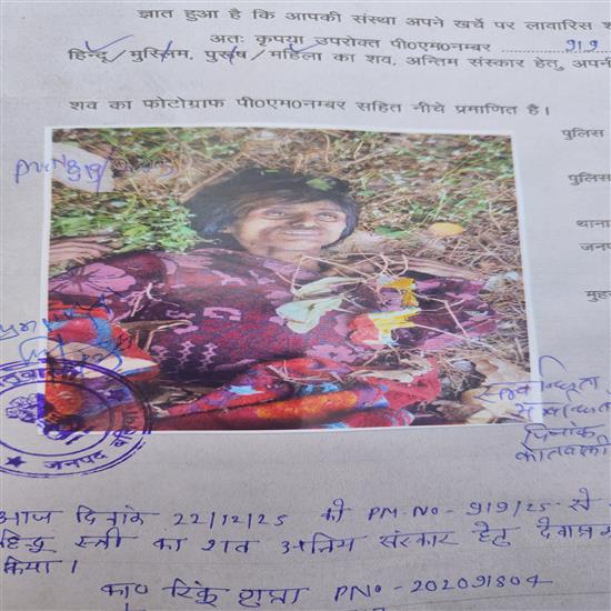 यूपी बलिया l देव सेवा समिति द्वारा संचालित देवाश्रम के जनपद शाखा बलिया द्वारा सायं काल में एक अज्ञात हिन्दू स्त्री के शव का अन्तिम संस्कार अवधूत सन्त निबहना बाबा मुक्ति धाम गढ़मलपुर बलिया में किया गया l इसकी जानकारी देवाश्रम के जिला संरक्षक बलिया डा कुंवर अरुण सिंह द्वारा दी गई। बताया गया कि थाना कोतवाली बलिया नगर पुलिस द्वारा पोस्टमार्टम संख्या 919 /2025 के तहत देवाश्रम की बलिया शाखा को दिनांक 22.12.2025 को अपराह्न 2 बजे अन्तिम संस्कार हेतु एक अज्ञात हिन्दू स्त्री का शव निःशुल्क प्राप्त कराया गया। उक्त अज्ञात शव की लावारिस शव यात्रा देवाश्रम के अंतिम संस्कार दल बलिया के अध्यक्ष दीप नारायण सिंह की अध्यक्षता में पोस्ट मार्टम हाउस बलिया से जय शिव जय शव व राम नाम सत्य है के उद्घोष के साथ प्रारम्भ होकर अवधूत सन्त निबहना बाबा मुक्ति धाम गढ़मलपुर बलिया पहुंची जहाँ सायंकाल 03:45 बजे देवाश्रम के प्रबंध निदेशक पी एन सिंह द्वारा शव को पूरे विधि विधान से मुखाग्नि दी गई। अंतिम संस्कार का सम्पूर्ण खर्च चौक बलिया के सुप्रसिद्ध व्यवसायी व प्रखर समाजसेवी अनुज सरावगी द्वारा देश के उन वीर जवानों की स्मृति में सहर्ष वहन किया गया जिनकी अंतयेष्ठी किन्ही परिस्थिति वश नहीं हो पायी थी । उपरोक्त लावारिस शव यात्रा में देवाश्रम बलिया के जिला सलाहकार सुरेन्द्र यादव देवाश्रम के अंतिम संस्कार दल के अध्यक्ष दीप नारायण सिंह वरिष्ठ उपाध्यक्ष अनिल प्रताप नारायण सिंह उर्फ़ भगत सिंह,महामंत्री गणेश प्रसाद,मंत्री भरत प्रसाद प्रीतम राजभर जितेंद्र पासवान एवं अनुज प्रताप सेंगर घूरा डोम सहित पी एन सिंह सम्मिलित रहे। उपरोक्त अज्ञात शव का अस्थि कलश देवाश्रम की बलिया इकाई के पास संरक्षित रहेगा जो ज्ञात होने पर उनके परिजनों को निः शुल्क सौंप दिया जायेगा। रिपोट - परमात्मा नन्द सिंह 151173894