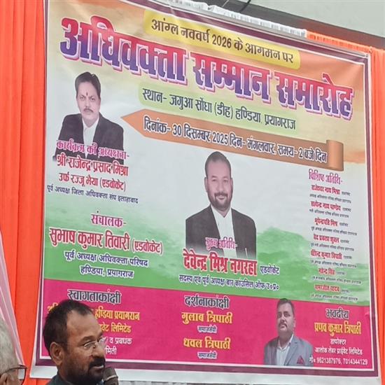 उत्तर प्रदेश प्रयागराज से बड़ी खबर प्रयागराज हंडिया तहसील अंतर्गत जगुआ सोधा गांव में अधिवक्ता सम्मान समारोह कार्यक्रम का आयोजन किया गया आपको बता दे की मंगलवार को जगुआ सोधा डीह ललित पुरम में अधिवक्ता सम्मान समारोह कार्यक्रम का आयोजक वरिष्ठ समाज सेवी गुलाब त्रिपाठी द्वारा अधिवक्ताओं को हर वर्ष 30 दिसंबर को अपने आवास पर अंग वस्त्र पेन डायरी देकर सम्मानित किये और वही पर अधिवक्ताओं को गुलाब त्रिपाठी ने नववर्ष की शुभकामनाएं व बधाई देते हुए अधिवक्ताओं से अपील करते हुए एकता बनाए रखने की बात कहे और वही कार्यक्रम में मुख्य अतिथि देवेंद्र मिश्रा नगरहा सदस्य एवं पूर्व अध्यक्ष बार काउंसिल आफ उत्तर प्रदेश व विशिष्ट अतिथि में राजेंद्र नाथ मिश्रा एडवोकेट सत्येंद्र नाथ पांडे भूपेंद्रपति मिश्रा वेद प्रकाश शुक्ला धीरेंद्र शुक्ला त्रिपाठी महेंद्र सिंह बबलू मिश्रा गोल्डी शुक्ला ओम प्रकाश पांडे विकास मिश्रा विशाल मिश्रा पंकज पांडे धवल त्रिपाठी आदि लोग मौजूद रहे और वही कार्यक्रम की अध्यक्षता कर रहे राजेंद्र प्रसाद मिश्रा उर्फ राजू भैया (एडवोकेट) व संचालक सुभाष तिवारी पूर्व अध्यक्ष अधिवक्ता परिषद हड़िया प्रयागराज और वहीं कार्यक्रम के अंत में प्रणव त्रिपाठी व धवल त्रिपाठी ने सभी अतिथियों अधिवक्ताओं और क्षेत्र वासियों के प्रति आभार व्यक्त किया इस अवसर पर अधिवक्ता गढ़ एवं क्षेत्र के सम्मानित लोग मौजूद रहे । प्रयागराज से डिस्ट्रिक्ट इंचार्ज प्रदीप मिश्रा फास्ट न्यूज़ इंडिया
