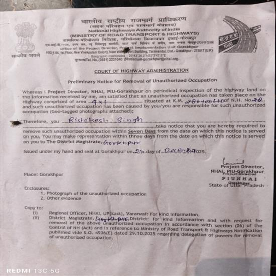 फास्ट न्यूज़ इंडिया यूपी गोरखपुर एम्स थाना के क्षेञ जगदीशपुर में एनएचएआई ने कुछ दुकानदारों को अवैध अतिक्रमण का नोटिस दिया है। एनएचएआई के मुताबिक जिस जमीन का भुगतान पहले किया जा चुका है, उसी में सड़क के किनारे के लोगों ने अतिक्रमण किया है। नोटिस मिलने के बाद बाजार में हड़कंप मच गया है। वर्ष 2005 में जगदीशपुर से कुशीनगर फोरलेन का निर्माण शुरू हो रहा था तो उस समय एक तय मानक पर जमीन का अधिग्रहण के लिये एनएचएआई द्वारा भुगतान किया गया था। एनएचएआई का कहना है कि सड़क तो बनी लेकिन सड़क के किनारे कुछ जमीन खाली छोड़ दी गई थी। अब उस जमीनो को सड़क के किनारे के लोग दुकान व मकान बनाकर कब्जा कर लिया है। जसवीर मोदनवाल 151167985