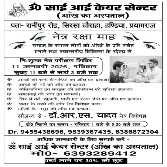 प्रयागराज हंडिया तहसील अंतर्गत रानीपुर रोड, सिरसा चौराहा पर ओम साईं आई केयर सेंटर में निशुल्क नेत्र परीक्षण शिविर का आयोजन विगत वर्षों की भात इस वर्ष आज किया गया। और वहीं पर पत्रकारों से बातचीत के दौरान डॉ आर. एस. यादव ने बताया कि इस क्षेत्र में लगभग 20 से 35 प्रतिशत लोग अपनी आंखों की सही देखभाल नहीं कर पाते हैं, जिससे मोतिया बिंद जैसी समस्याएं हो जाती हैं और इस शिविर के माध्यम से विशेष रूप से विधवाओं और जरूरतमंद लोगों को प्राथमिकता दी जाती। और इस शिविर के माध्यम से निशुल्क आंखों की इलाज व निशुल्क आंखों की ऑपरेशन की भी व्यवस्था की गई है। और यह पहल क्षेत्र के गरीब असहाय लोगों के आंखों की देखभाल और स्वास्थ्य को बेहतर बनाने की दिशा में महत्वपूर्ण कदम है। और वहीं पर भावी जिला पंचायत सदस्य प्रत्याशी वार्ड नंबर दो धनुपूर पूर्व छात्र नेता सुमित विश्वकर्मा ने बताया कि ओम साईं आई केयर सेन्टर (आंख का अस्पताल) रानीपुर रोड सिरसा चौराहा पर डॉ आर. एस. यादव द्वारा विगत वर्षों के भात इस वर्ष 11 जनवरी 2026 को निशुल्क नेत्र परीक्षण शिविर का आयोजन किया गया और शिविर के माध्यम से समाज के समस्त लोगों को आंखों के प्रति सचेत बनाने तथा उच्च स्तरीय चिकित्सा के उद्देश्य से आगे भी निशुल्क शिविर का आयोजन होता रहेगा इस मौके पर डॉ आर. एस. यादव व डॉ श्याम वर्मा वी इंद्रेश यादव आदि लोग मौजूद रहे। देखे प्रयागराज से प्रदीप मिश्रा की रिपोट