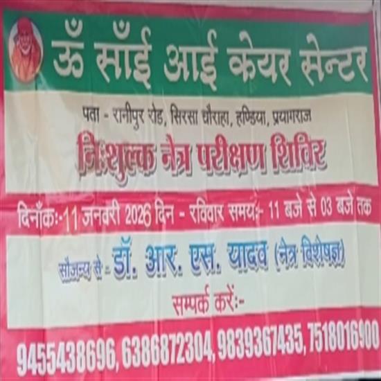 प्रयागराज हंडिया तहसील के रानीपुर रोड, सिरसा चौराहा पर ओम साईं आई केयर सेंटर में निशुल्क नेत्र परीक्षण शिविर का आयोजन विगत वर्षों की भात इस वर्ष आज किया गया। और वहीं पर पत्रकारों से बातचीत के दौरान डॉ आर. एस. यादव ने बताया कि इस क्षेत्र में लगभग 20 से 35 प्रतिशत लोग अपनी आंखों की सही देखभाल नहीं कर पाते हैं, जिससे मोतिया बिंद जैसी समस्याएं हो जाती हैं।और इस शिविर के माध्यम से विशेष रूप से विधवाओं और जरूरतमंद लोगों को प्राथमिकता दी जाती। और इस शिविर के माध्यम से निशुल्क आंखों की इलाज व निशुल्क आंखों की ऑपरेशन की भी व्यवस्था की गई है। और यह पहल क्षेत्र के गरीब असहाय लोगों के आंखों की देखभाल और स्वास्थ्य को बेहतर बनाने की दिशा में महत्वपूर्ण कदम है। और वहीं पर भावी जिला पंचायत सदस्य प्रत्याशी वार्ड नंबर दो धनुपूर पूर्व छात्र नेता सुमित विश्वकर्मा ने बताया कि ओम साईं आई केयर सेन्टर (आंख का अस्पताल) रानीपुर रोड सिरसा चौराहा पर डॉ आर. एस. यादव द्वारा विगत वर्षों के भात इस वर्ष 11 जनवरी 2026 को निशुल्क नेत्र परीक्षण शिविर का आयोजन किया गया और शिविर के माध्यम से समाज के समस्त लोगों को आंखों के प्रति सचेत बनाने तथा उच्च स्तरीय चिकित्सा के उद्देश्य से आगे भी निशुल्क शिविर का आयोजन होता रहेगा इस मौके पर डॉ आर. एस. यादव व डॉ श्याम वर्मा वी इंद्रेश यादव आदि लोग मौजूद रहे। रिपोट - प्रदीप मिश्रा 151045438