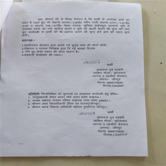 मुर्तजाबाद निवासी लालचन्द्र गौड़ ने उच्चाधिकारियों को दिए प्रार्थना पत्र में बताया कि गांव की आराजी संख्या 670ख (नवीन परती) और 670ग (ऊसर), जो ग्राम समाज की संपत्ति है, उसे बेचन पुत्र जयराम के वारिसानों ने फर्जी तरीके से अपने नाम करवा लिया है। इतना ही नहीं, आरोप है कि नेहरू स्मारक जूनियर हाईस्कूल की सरकारी भूमि (आराजी संख्या 708) से भी 67 डिसमिल जमीन 'सुरेंद्रनाथ सुधीर शिक्षण संस्थान' के प्रबंधक द्वारा अपने नाम दर्ज करा ली गई है।