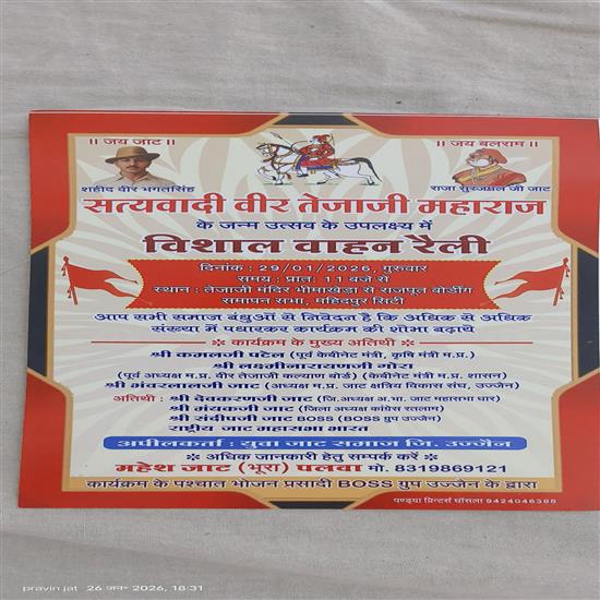 इस अवसर पर समाज के वरिष्ठजन, जनप्रतिनिधि एवं आयोजन समिति के सदस्य मौजूद रहे। यह जानकारी महेश जाट, ग्राम पलवा द्वारा दी गई। देखे महिदपुर से संजय जाट कि खास खबर