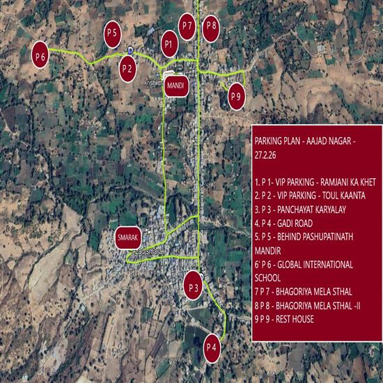 V.I.P एवं अतिविशिष्ट पार्किंग: इशाक मकरानी के भाई का खेत एवं माधव पेट्रोल पंप के सामने तौल काँटा क्षेत्र।