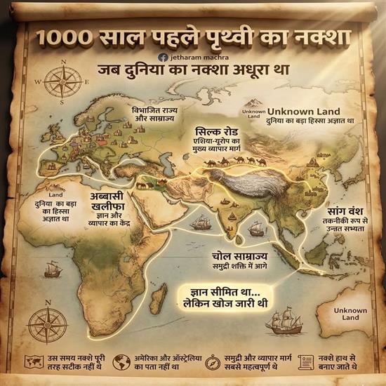 आज हम जिस आधुनिक दुनिया का नक्शा देखते हैं, वह हजारों साल की खोज और ज्ञान का परिणाम है। लेकिन ज़रा सोचिए… करीब 1000 साल पहले (1000 AD) दुनिया कैसी दिखती थी? तब न सैटेलाइट थे, न GPS… फिर भी इंसान ने अपने सीमित ज्ञान से पूरी दुनिया को समझने की कोशिश की 🌍