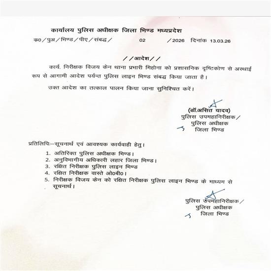 भिंड पुलिस अधीक्षक ने मिहोना थाना प्रभारी को किया लाईन हाजिर