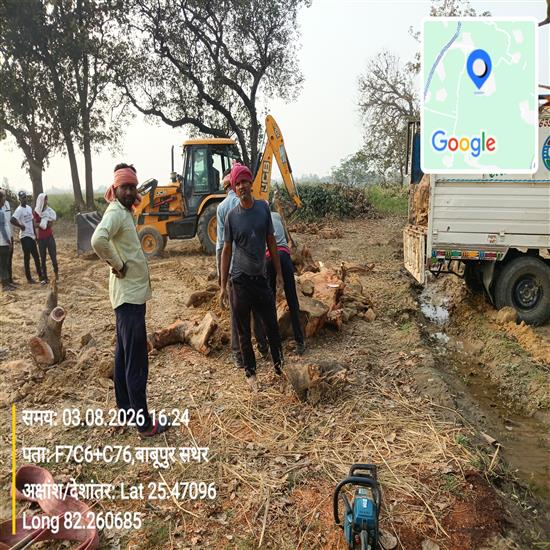 हंडिया में हरे पेड़ों पर चल रहा आरा, जेसीबी से जड़ समेत उखाड़े जा रहे पेड़।