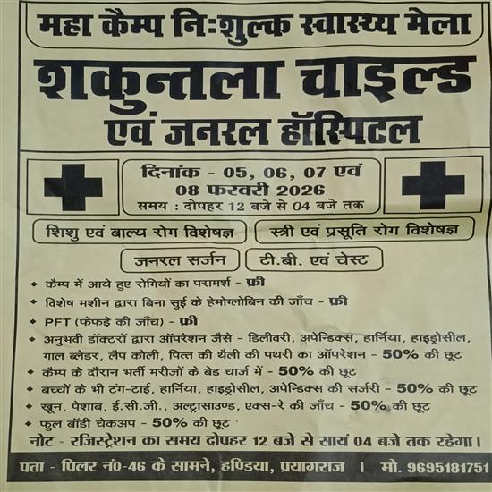 शकुंतला चाइल्ड एंड जनरल हॉस्पिटल में निशुल्क स्वास्थ्य मेला व महा कैंम्प का आयोजन