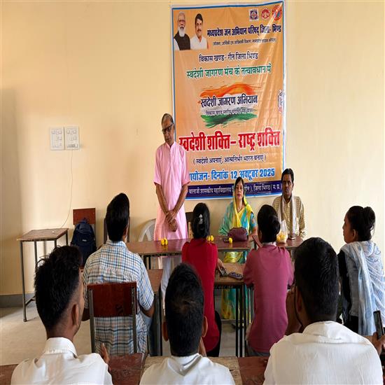 मिहोना-(म.प्र. जन अभियान परिषद) के जिला समन्वयक श्री शिवप्रताप भदौरिया जी के मार्गदर्शन मैं शा. बालाजी महाविद्यालय, बालाजी, मिहोना मैं स्वदेशी जागरण मंच के तत्वावधान मैं एक वृहद संगोष्ठी का आयोजन आज दिनांक-12/10/2025 दिन रविवार को किया गया, जिसकी अध्यक्षता करते हुए पूर्व ब्लॉक शिक्षा अधिकारी श्री बी.पी. त्यागी जी ने कहा कि आत्मनिर्भर भारत तभी संभव है जब हम विदेशी वस्तुओं का बहिष्कार करें और स्वदेशी वस्तुओं का उपयोग करें। इसके पश्चात मुख्य अतिथि ब्लॉक समन्वयक महोदय श्री सुनील चतुर्वेदी जी द्वारा स्वदेशी जागरण मंच के साथ जुड़ने पर जोड़ दिया गया, एवं उपस्थित bsw/msw के छात्रों, समाजसेवियों एवं अन्य नागरिकों को स्वदेशी जागरण हेतु सहयोग, जागरण संगोष्ठियों के आयोजन एवं नुक्कड़ नाटक आदि करने के लिए प्रेरित किया गया, विशिष्ट अतिथि श्रीमती निशा राजावत द्वारा भी कार्यक्रम मैं स्वदेशी जागरण मंच के समर्थन हेतु आह्वान किया गया, कार्यक्रम का संचालन परामर्शदाता श्री हरिबाबू निराला जी द्वारा किया गया, कार्यक्रम मैं विशेष रूप से परामर्शदाता प्रमोद तिवारी, सचिन शर्मा उपस्थित रहे एवं विशेष रूप से अधिवक्ता आशीष त्यागी, भाजपा सोशल मीडिया प्रभारी मंडल-रौन रिंकेश पुरोहित, उपस्थित रहे एवं रामवरण ओझा, ब्रजेश कुशवाह, ज्योति शर्मा आदि भी उपस्थित रहे।