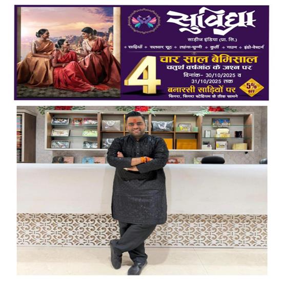 सुविधा साड़ीज इंडिया प्रा. लि. सिगरा का चौथा वर्षगांठ 30 व 31 अक्टूबर को बड़े ही हर्षोल्लास के साथ मनाया जा रहा है इस अवसर पर वाराणसी के सभी सम्मानित ग्राहकों को 5 प्रतिशत की विशेष छूट दी जा रही है । शोरूम के अधिष्ठाता अमित सेवारमानी ने बताया कि हमारे यहां बनारसी साड़िया, प्योर सिल्क साड़ी, लहंगा एवं फैंसी साड़ियों का विशाल संग्रह उपलब्ध है
