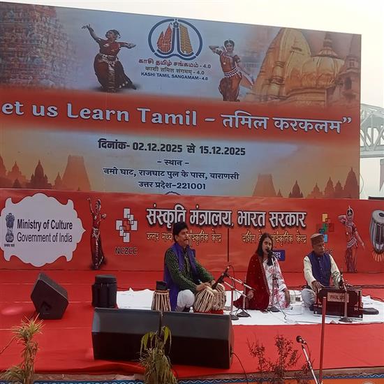 वाराणसी । शिक्षा-मन्त्रालय भारत सरकार, उत्तर मध्य क्षेत्र सांस्कृतिक केन्द्र प्रयागराज और दक्षिण क्षेत्र सांस्कृतिक केन्द्र द्वारा काशी के नमो घाट पर चल रहे “काशी तमिल संगमम्-04” में आज सम्पूर्णानन्द संस्कृत विश्वविद्यालय की संगीत विभाग की अध्यापिका डॉ. श्रुति सारस्वत उपाध्याय की सांगीतिक प्रस्तुति हुई। उन्होंने मां गंगा की स्तुति हे ग़गा मईया बसब एही नगरी और भजन तीर्थों में विख्यात काशी विश्वनाथ सुनाकर श्रोताओं को मंत्रमुग्ध कर दिया।