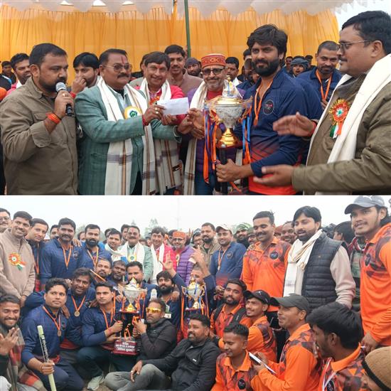 विजेता टीम को ट्राफी प्रदान करते अतिथि व आयोजन समिति के लोगट्राफी के साथ विजेता एवं उपविजेता टीम के खिलाड़ियों के बीच अतिथिगण
