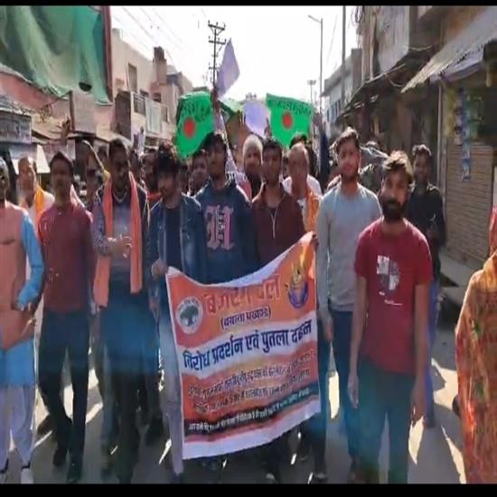 राजस्थान बयाना- कस्बे के कचहरी रोड स्थित पुलिस थाने के सामने, विश्व हिन्दू परिषद् और बजरंग दल के कार्यकर्ताओं द्वारा बांग्लादेश में हिन्दुओं पर हो रहे कथित अत्याचार के विरोध में बांग्लादेश सरकार का पुतला फूंककर, नारेबाजी की गई।