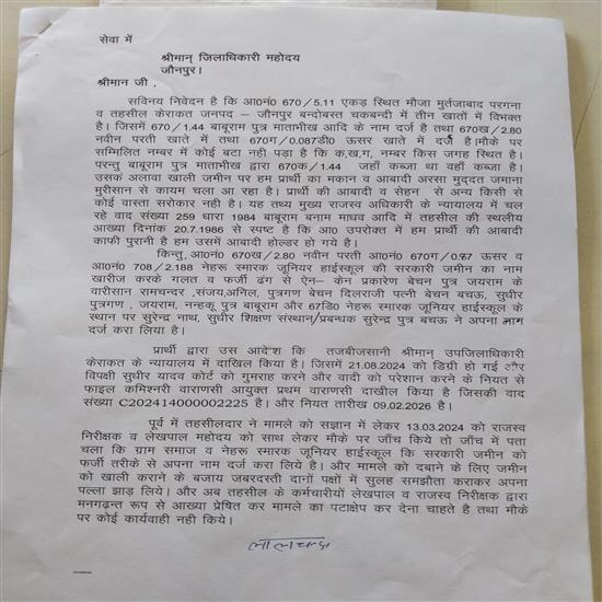मुर्तजाबाद निवासी लालचन्द्र गौड़ ने उच्चाधिकारियों को दिए प्रार्थना पत्र में बताया कि गांव की आराजी संख्या 670ख (नवीन परती) और 670ग (ऊसर), जो ग्राम समाज की संपत्ति है, उसे बेचन पुत्र जयराम के वारिसानों ने फर्जी तरीके से अपने नाम करवा लिया है। इतना ही नहीं, आरोप है कि नेहरू स्मारक जूनियर हाईस्कूल की सरकारी भूमि (आराजी संख्या 708) से भी 67 डिसमिल जमीन 'सुरेंद्रनाथ सुधीर शिक्षण संस्थान' के प्रबंधक द्वारा अपने नाम दर्ज करा ली गई है।