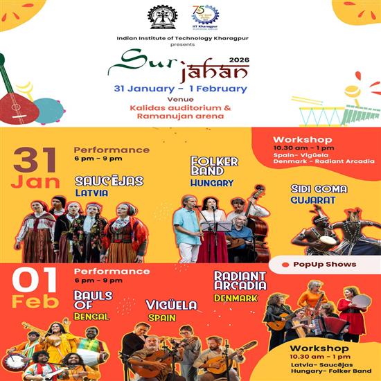 ये सभी बैंड पारंपरिक संगीत शैलियों को समकालीन अभिव्यक्ति के साथ प्रस्तुत करने के लिए अंतरराष्ट्रीय स्तर पर विख्यात हैं। भारत की समृद्ध संगीत परंपरा का प्रतिनिधित्व गुजरात के सिद्दी गोमा तथा बंगाल के बाउल कलाकार करेंगे, जिनकी प्रस्तुतियाँ दर्शकों को विविध लयों, दर्शन और जीवंत सांस्कृतिक अनुभवों की यात्रा पर ले जाएंगी। संध्याकालीन कार्यक्रमों के अतिरिक्त, महोत्सव के दौरान दिवसीय कार्यशालाओं का आयोजन भी किया जाएगा, जिनका उद्देश्य विभिन्न लोक संगीत परंपराओं, वाद्ययंत्रों और शैलियों की गहन समझ विकसित करना तथा कलाकारों और दर्शकों के बीच सार्थक संवाद को बढ़ावा देना है। इसके साथ ही, ओडिशा के कोरापुट क्षेत्र की डुरुआ जनजाति के लोक संगीत एवं नृत्य तथा पश्चिम बंगाल की संथाल जनजाति की पारंपरिक कठपुतली कला ‘चादर बादर’ पर आधारित विशेष पॉप-अप प्रस्तुतियाँ भी होंगी। आयोजन समिति आईआईटी खड़गपुर परिवार—परिसर निवासियों, संकाय सदस्यों, कर्मचारियों, विद्यार्थियों एवं पूर्व छात्रों—से इस विशिष्ट एवं अंतरराष्ट्रीय सांस्कृतिक उत्सव का साक्षी बनने के लिए सादर आमंत्रण देती है। सुर जहान न केवल संगीत का, बल्कि सांस्कृतिक एकता, विविधता और वैश्विक सौहार्द का उत्सव होगा, जो आईआईटी खड़गपुर के प्लैटिनम जुबली वर्ष की भावना को पूर्ण रूप से प्रतिबिंबित करता है।