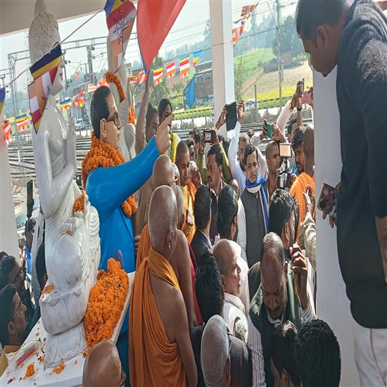 मुहम्मदाबाद गोहना। स्थानीय कस्बा के पूर्वी रेल फाटक के समीप अंबेडकर स्थल में शनिवार को गौतम बुद्ध, संत शिरोमणि संत रविदास और भारत रत्न बाबा डॉक्टर भीम राव अंबेडकर की मूर्ति का अनावरण हुआ। कार्यक्रम के मुख्य अतिथि धम्म लर्निंग सेंटर सारनाथ वाराणसी के अध्यक्ष भिक्षु चन्दिमा थेरो द्वारा मूर्ति का अनावरण हुआ। इसके पहले कार्यक्रम स्थल से विशाल शोभायात्रा निकाली गई, इसमें हजारों लोग शामिल हुए। डॉ अंबेडकर बहुजन हिताय सेवा समिति के तत्वाधान में आयोजित कार्यक्रम में दूर दराज से पहुंचे भिक्षुओं और समाज के पथ प्रदर्शकों ने हिस्सा लिया। अंबेडकर स्थल पर महामानव सिद्धार्थ गौतम बुद्ध, संत शिरोमणि भक्त रविदास और डॉ भीमराव अंबेडकर की मूर्ति के अनावरण के पूर्व शुक्रवार को बुद्ध चंद्रोदय पाठ का आयोजन हुआ। अर्धरात्रि तक चले कार्यक्रम में सैकड़ो अनुयाई मौजूद रहे। सुबह 9:00 बजे शोभायात्रा निकाली जो कस्बा के शहीद चौराहा, तहसील, कैलेंडर तिराहा, मुख्य बाजार होते हुए वापस कार्यक्रम स्थल पर पहुंची । कार्यक्रम के मुख्य अतिथि भिक्षु चंदिमा थेरो ने तीनों मूर्ति का अनावरण किया। इस दौरान गग भेदी नारों से पूरा स्थल गूंज गया। संस्था के प्रबंधक दिलीप साधु ,उप प्रबंधक डॉक्टर सत्यदेव भारती, अध्यक्ष डॉ सोचन भारती, लेखा परीक्षक अशोक मास्टर ने सभी आगंतुकों का स्वागत किया। इस दौरान वक्ताओं ने महात्मा बुद्ध संत रविदास और डॉ भीमराव अंबेडकर के जीवन पर प्रकाश डालते हुए उन्हें सर्व समाज का पथ प्रदर्शक बताया। कहा कि तीनों महापुरुषों ने समाज को सही राह दिखाने का कार्य किया। उनके उपदेशों और आदर्शों पर समाज की तरक्की की बुनियाद टिकी है। कार्यक्रम में प्रमुख रूप से क्षेत्रीय विधायक राजेंद्र कुमार लक्षीराम प्रसाद, रंजना भारती, डॉक्टर धर्म सिंह गौतम, संतोष राजभर ,राहुल बोध,अध्यक्ष प्रतिनिधि दीपक गुप्ता डायमंड, गुड्डू, मनोज कुमार, सहित सैकड़ो लोग मौजूद रहे। रिपोट - अजय कुमार 151170379