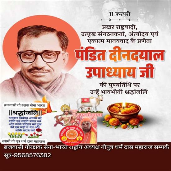 मथुरा। आपको बता दें कि दिनांक 11 फरवरी को पंडित दीनदयाल उपाध्याय को भारत माता ने अपने चरणों में जगह दी और वैकुंठ धाम को चले गए और ब्रजवासी गौ रक्षक सेना भारत संगठन के राष्ट्रीय अध्यक्ष गौ पुत्र धर्म दास महाराज के साथ समस्त संतों, किन्नरों, नर, नारियों और युवा पीढ़ी की तरह से भव श्रद्धांजलि अर्पित की। पंडित दीनदयाल उपाध्याय एक महान भारतीय राजनेता, विचारक और संगठनकर्ता थे। उनका जन्म 25 सितंबर 1916 को उत्तर प्रदेश के मथुरा जिले के नगला चंद्रभान गांव में हुआ था। उनके पिता भगवती प्रसाद उपाध्याय एक रेलवे कर्मचारी थे और माता रामप्यारी एक धार्मिक महिला थीं ।