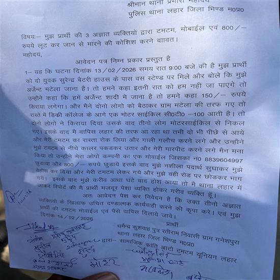 लहार थाना क्षेत्र में टमटम चालक के साथ मारपीट और लूट की गंभीर घटना सामने आई है। पीड़ित धर्मेंद्र कुशवाह पुत्र रतीराम निवासी ग्राम गनेशपुरा ने थाने में आवेदन देकर तीन अज्ञात युवकों के खिलाफ सख्त कार्रवाई की मांग की है।