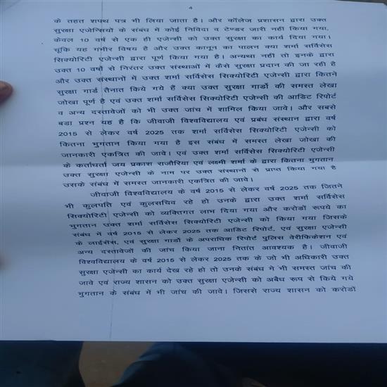 ग्वालियर जयप्रकाश मौर्य ने जीवाजी विश्वविद्यालय एवं लक्ष्मी शर्मा तथा राजोरिया पर भ्रष्टाचार के आरोप लगाए हैं उन्होंने आरोप लगाते हुए कहा कि पिछले 10 वर्षों से संस्थान द्वारा बिना टेंडर निकाले एक ही संस्थान को ठेका दिया जा रहा है जिसके विरुद्ध लोकायुक्त एवं ईओडब्ल्यू में शिकायती आवेदन दिया गया है जयप्रकाश मौर्य ने आज एक पत्रकार वार्ता में कही उन्होंने जानकारी देते हुए बताया के बिना टेंडर निकाले कोई भी संस्थान किसी को ठेका नहीं दे सकता है लेकिन जीवाजी विश्वविद्यालय द्वारा नियमों को ताक पर रखकर एक ही कंपनी को लगातार ठेका दिया जा रहा है इस ठेके के माध्यम से जयप्रकाश राजोरिया एवं लक्ष्मी शर्मा को लाभ पहुंचाने के उद्देश्य से ठेका दिया जा रहा है उन्होंने आरोप लगाते हुए कहा मांग की है कि इनकी ऑडिट रिपोर्ट की समीक्षा की जावे और जो सिक्योरिटी गार्ड लगाए गए हैं उनका पुलिस वेरिफिकेशन हुआ है या नहीं हुआ है इसकी जांच की जावे उन्होंने प्रशासन से मांग की है की जांच करा कर दोषियों के खिलाफ उचित कार्रवाई की जाए।