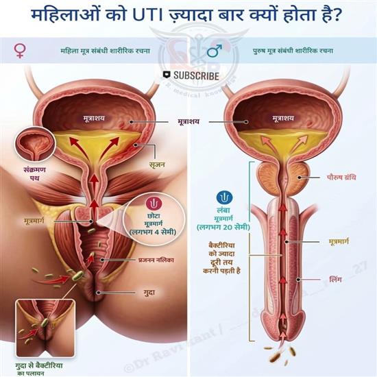 ..महिलाओं और पुरुषों के यूरिनरी सिस्टम (मूत्र प्रणाली) में मौजूद शारीरिक अंतर यह बताते हैं कि महिलाओं को यूरिनरी ट्रैक्ट इन्फेक्शन (UTIs) होने का खतरा ज़्यादा क्यों होता है। पुरुषों के यूरेथ्रा (मूत्र नली) की तुलना में, जो लगभग 20 cm लंबा होता है, महिलाओं का यूरेथ्रा काफ़ी छोटा होता है, जिसकी लंबाई लगभग 4 cm होती है। इस कम दूरी के कारण बैक्टीरिया ज़्यादा आसानी से ब्लैडर (मूत्राशय) तक पहुँच जाते हैं। इसके अलावा, महिलाओं के यूरेथ्रा का गुदा (anus) के पास होना बैक्टीरिया के फैलने में मदद करता है, जिससे ब्लैडर में सूजन हो सकती है। इन्फेक्शन के खतरे को कम करने के लिए, साफ़-सफ़ाई का सही ध्यान रखना और शरीर में पानी की कमी न होने देना (हाइड्रेटेड रहना) कुछ ज़रूरी चिकित्सकीय सुझाव हैं।