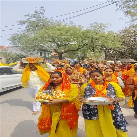 कलश यात्रा स्टेशन रोड, बलुआ रोड और वाराणसी रोड होते हुए पूरे बाजार में भ्रमण करती हुई कथा स्थल श्री हनुमान जी मंदिर, गौरा मोड़ के पास पहुंची, जहां विधि-विधान से कलश की स्थापना की गई।
