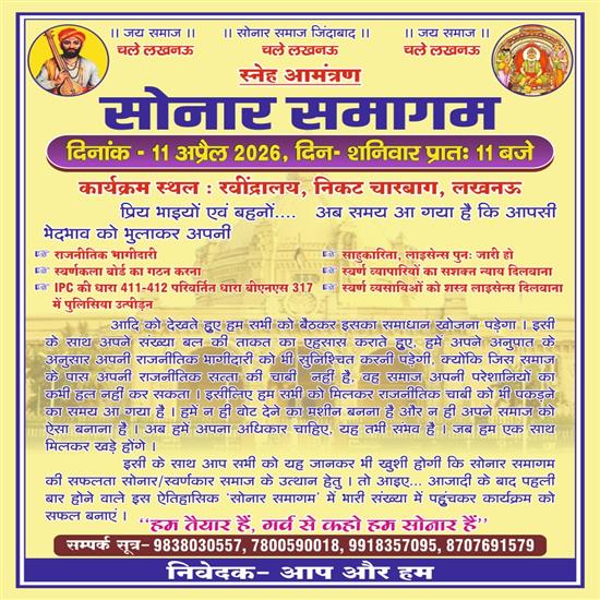 - लखनऊ में होने वाले सोनार समागम के लिए किया गया जुटान का आह्वान