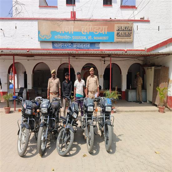 प्रयागराज पुलिस आयुक्त व अतिरिक्त पुलिस आयुक्त के निर्देशन में अपराध एवं अपराधियों के विरुद्ध चलाये जा रहे अभियान के क्रम में प्रयागराज पुलिस उपायुक्त व अपर पुलिस उपायुक्त गंगानगर के पर्यवेक्षण में व सहायक पुलिस आयुक्त हण्डिया शेषधर पांडे के कुशल नेतृत्व में थाना हण्डिया पुलिस टीम द्वारा दिनांक-31 मार्च 2026 को थाना हण्डिया पर पंजीकृत मुकदमा अपराध संख्या -134/2026 धारा-303(2)भादवी न्याय संख्या से सम्बंधित 01 अभियुक्त शैलेन्द्र पटेल पुत्र उदयराज निवासी ग्राम मोहम्मदाबाद बेलहरा थाना उतरांव कमिश्नरेट प्रयागराज को थाना हण्डिया क्षेत्रान्तर्गत सैदाबाद स्थित पावर हाउस के पास से गिरफ्तार किया गया तथा 02 बाल अपचारी को पुलिस अभिरक्षा में लिया गया तथा अभियुक्त तीरथ सरोज पुत्र धनेश सरोज निवासी ग्राम सिंधापुर मन्सूराबाद थाना नवाबगंज कमिश्नरेट प्रयागराज को थाना हण्डिया क्षेत्रान्तर्गत भेस्की पुलिया के पास से गिरफ्तार किया गया तथा 01 बाल अपचारी को पुलिस अभिरक्षा में लिया गया । उपरोक्त अभियुक्तों/बाल अपचारी के कब्जे से मुकदमा उपरोक्त में चोरी की मोटरसाइकिल तथा चोरी की 04 अन्य मोटरसाइकिल बरामद किया गया । उक्त गिरफ्तारी/बरामदगी के आधार पर मुकदमा उपरोक्त में धारा-317(2)/317(4)317(5)/319(2)/318(4)/336(3)/338/340(2)/342(1) भादवी न्याय संख्या की बढ़ोत्तरी कर नियमानुसार विधिक कार्यवाही की गयी ।