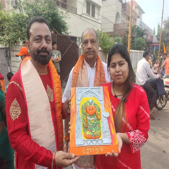 मंदिर के महंत विशंभर नाथ मिश्रा ने प्रभु की आरती उतारी सामूहिक हनुमान चालीसा का पाठ किया और रजत ध्वजा संस्था के अध्यक्ष कौशल शर्मा ने महंत विशंभर नाथ मिश्र को सौपी जो हनुमान जी के शिखर पर लगेगी।
