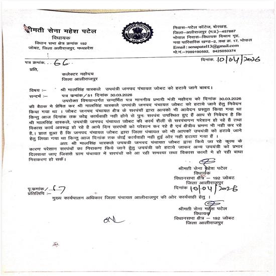 जोबट विधानसभा क्षेत्र में जनपद पंचायत जोबट के उपयंत्री मालसिंह वास्कले को पद से हटाने की मांग अब तेज होती नजर आ रही है। शुक्रवार को जोबट विधायक सेना महेश पटेल के नेतृत्व में ब्लॉक के सरपंचों का एक बड़ा प्रतिनिधिमंडल कलेक्टर कार्यालय पहुँचा, जहां उन्होंने विस्तृत शिकायत पत्र सौंपकर तत्काल कार्रवाई की मांग की।