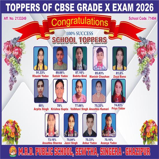 गाजीपुर । जहां सीबीएसई बोर्ड की कक्षा 10वीं के परीक्षा परिणाम घोषित होते ही एम.आर.डी. पब्लिक स्कूल, सेवठा सिंगेरा में खुशी की लहर दौड़ गई । इस विद्यालय का परीक्षा फल शत- प्रतिशत रहा , जिसमें छात्राओं ने एक बार फिर अपनी मेधा का लोहा मनवाते हुए , शीर्ष स्थानों पर कब्जा जमाया । हालांकि छात्रों का प्रदर्शन भी संतोषजनक रहा , लेकिन टॉपर्स की सूची में छात्राओं का डंका बजता नजर आया । वही शानदार प्रदर्शन करने वाले छात्र -छात्राएं विद्यालय के 100% सफल परिणामों के बीच खुशी यादव ने 91.33% अंक प्राप्त कर स्कूल में (प्रथम स्थान) हासिल किया । वहीं अन्य टॉपर्स में प्रमुख नाम इस प्रकार हैं सतीश यादव: 89.66% ,