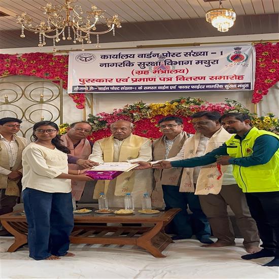 मथुरा स्थानीय होटल शुभारंभ इन में सिविल डिफेंस मथुरा की वार्डन पोस्ट संख्या–01 के पोस्ट वार्डन एवं मास्टर ट्रेनर अशोक यादव द्वारा आयोजित ‘प्रतिभा की खोज’ नागरिक सुरक्षा सामान्य ज्ञान प्रतियोगिता का पुरस्कार वितरण समारोह अत्यंत गरिमामयी वातावरण में संपन्न हुआ। कार्यक्रम का शुभारंभ मुख्य अतिथियों द्वारा माँ सरस्वती की प्रतिमा के सम्मुख दीप प्रज्ज्वलित कर किया गया। यह कार्यक्रम अपर जिलाधिकारी (नमामि गंगे) नंद प्रकाश मौर्य के निर्देशन एवं सहायक उपनियंत्रक नीरज श्रीवास्तव ,चीफ वार्डन राजीव अग्रवाल, डिप्टी चीफ वार्डन कल्याण दास अग्रवाल तथा डिवीजनल वार्डन भारत भूषण तिवारी के मार्गदर्शन में आयोजित किया गया। समारोह में मुख्य अतिथि के रूप में डिप्टी चीफ वार्डन कल्याण दास अग्रवाल एवं डिप्टी डिवीजनल वार्डन राजेश कुमार मित्तल उपस्थित रहे। समारोह के दौरान विशिष्ट अतिथि के रूप में सीनियर स्टाफ ऑफिसर दीपक चतुर्वेदी बैंकर, स्टाफ ऑफिसर दीपेश कुमार, रक्त मित्र फाउंडेशन के संस्थापक रविंद्र बंसल, समाजसेवी आशीष कुमार एवं ए सी एम बी स्कूल के वाइस प्रिंसिपल जितेंद्र कुमार ने विजयी प्रतिभागियों को प्रमाण-पत्र, शील्ड, मेडल और नकद पुरस्कार प्रदान कर उनका उत्साहवर्धन किया। कार्यक्रम की सफलता में वार्डन पोस्ट संख्या एक के पोस्ट वार्डन एवं मास्टर ट्रेनर ई. अशोक यादव और डिप्टी पोस्ट वार्डन विकास सोनी के नेतृत्व में समस्त वार्डनों एवं फायरफाइटरों का विशेष सहयोग रहा। अंत में ई. अशोक यादव ने सभी नवागंतुक अतिथियों एवं सहयोगियों का हृदय से आभार व्यक्त किया। इस अवसर पर मुख्य रूप से ई. अशोक यादव , गिरीश वार्ष्णेय, अध्यापिका दीक्षा शर्मा ,प्रमोद शर्मा कौशल किशोर, हेमन्त, राजेश कुमार शिवहरे, श्याम सिंह, पवन, विकास सोनी, विनोद, कन्हैया सैनी, शुभम सिंह, अनुज, पंकज धनगर, नंदू किशोर शर्मा,करिश्मा, गुलशेर, देवेन्द्र कुमार, हरी नारायण अग्रवाल, आकाश, सोनू शिवहरे, लाभांश, पंकज कुमार, ओम प्रकाश, रामसती, विनोद कुमार, जितेन्द्र कुमार, सुमित कुमार, दर्शन सिंह निषाद, विशाल कश्यप एवं विशाल उपस्थित रहे।